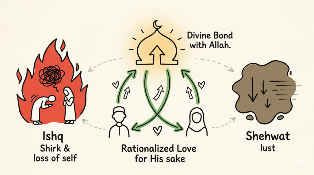 Summary The article critiques shallow media and poetic narratives of love, arguing that they often screw up the concept’s true essence. It defines a spectrum between “Ishq” (blameworthy passionate intoxication leading to Shirk and loss of individuality) and “Shehwat” (ephemeral baser instinct), locating “Muhabbat” as the proper Islamic middle path. The author asserts that true […]